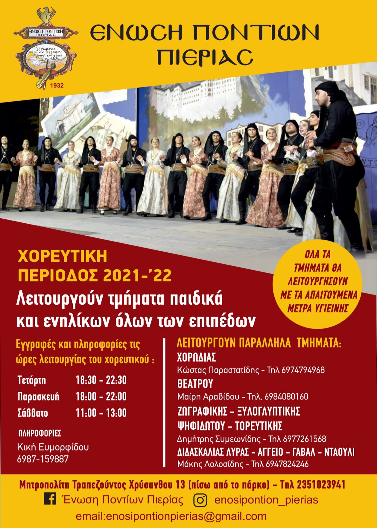 Η Ένωση Ποντίων Πιερίας ανακοινώνει στα µέλη και στους φίλους όλων των τµηµάτων του συλλόγου την έναρξη λειτουργίας της νέας Πολιτιστικής περιόδου 2021-2022.