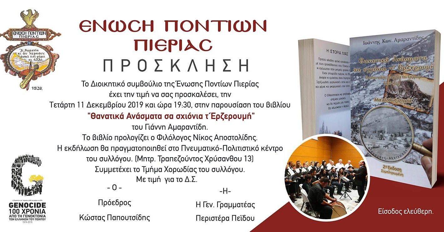 Η Ένωση Ποντίων Πιερίας στα πλαίσια µιας σειράς εκδηλώσεων που πραγµατοποίησε κατά το έτος 2019 για την µαύρη επέτειο των 100 χρόνων της Γενοκτονίας του Ποντιακού Ελληνισµού παρουσίασε τον συγγραφέα και πρόεδρο της Οργάνωσης Ποντίων Ν. Καστοριάς κ. Γιάννη Αµαραντίδη µε το βιβλίο του “Θανατικά Ανάσµατα σα σχιόνια τ’ Ερζερουµή”. Το βιβλίο αποτελεί ένα σύνολο µαρτυριών και διηγήσεων του παππού του και µιας πολύχρονης επιτόπιας έρευνας σε αυτά τα µέρη.