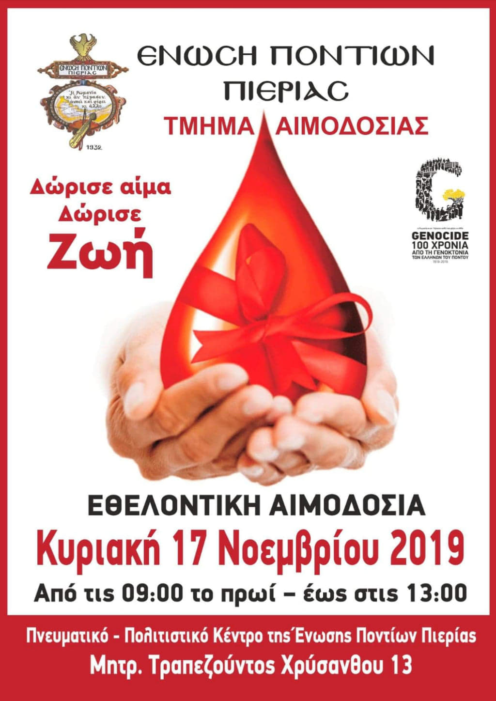 Εθελοντική Αιμοδοσία προς τιμή της 100ης Επετείου Μνήμης Γενοκτονίας του Ποντιακού Ελληνισμού