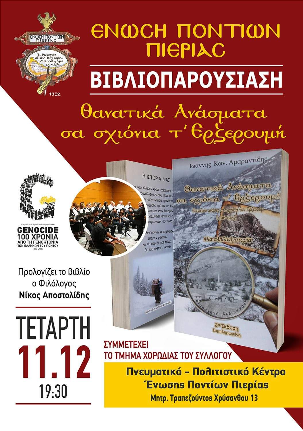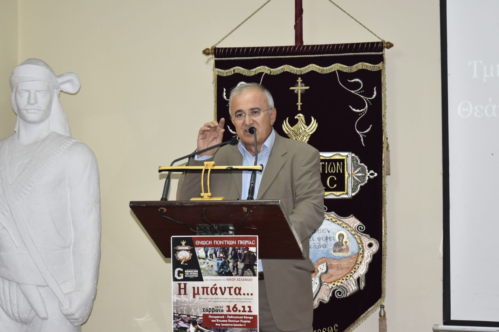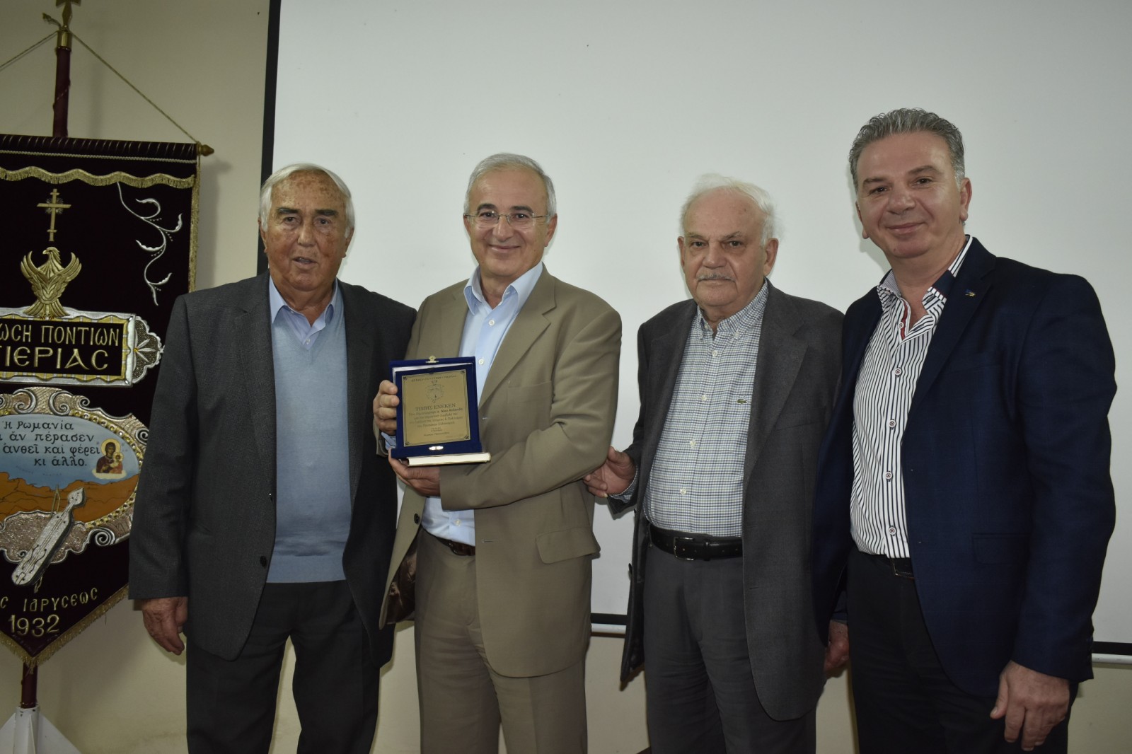 Μία ακόµη εκδήλωση, αφιερωµένη στην 100η Επέτειο Μνήµης της Γενοκτονίας του Ποντιακού Ελληνισµού, της Ένωσης Ποντίων Πιερίας στέφθηκε µε επιτυχία. Στην γεµάτη αίθουσα του Πνευµατικού-Πολιτιστικού κέντρου του συλλόγου τα µέλη και οι φίλοι είχαν την ευκαιρία να παρακολουθήσουν το βραβευµένο, συγκλονιστικό ντοκιµαντέρ “Η Μπάντα” του Δηµοσιογράφου κ. Νίκου Ασλανίδη. Για την σηµαντική συµβολή, του κ. Νίκου Ασλανίδη, στην προβολή της Ιστορίας και πολιτισµού του Ποντιακού Ελληνισµού, µέσα από την πολυετή δηµοσιογραφική του ιδιότητα, τίµησε το Διοικητικό συµ- βούλιο της Ενωσης Ποντίων Πιερίας. Την πλακέτα εκ µέρους του Διοικητικού συµβουλίου έδωσε ο Επίτιµος Πρόεδρος του συλλόγου κ. Μενέλαος Τερζόπουλος και ο επί σειρά ετών πρώην ταµίας του συλλόγου κ. Ισαάκ Ιορδανίδης.