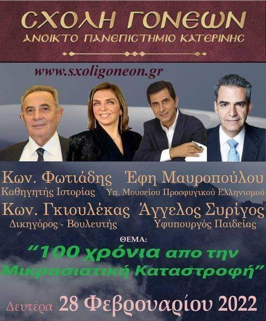 Η Ένωση Ποντίων Πιερίας μέσο του Προέδρου της  κ. Κώστα Παπουτσίδη συμμετείχε με δύο καίρια ερωτήματα που έθεσε στον Υφυπουργό Παιδείας κ. Συρίγο  σε διαδικτυακή εκδήλωση της σχολής γονέων Κατερίνης με θέμα: ¨𝟣𝟢𝟢 χρόνια από την Μικρασιατική καταστροφή΄.