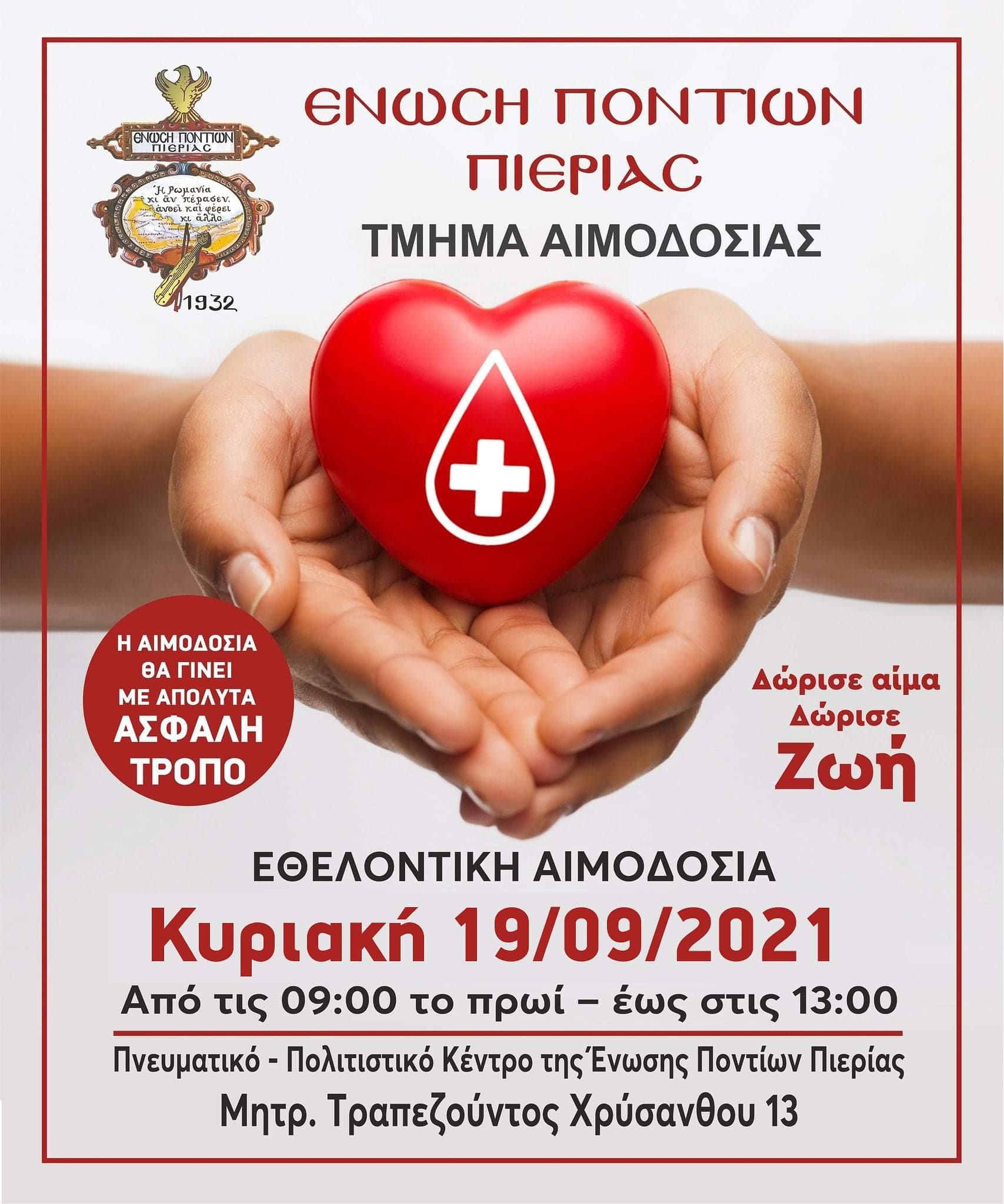 Παρά τις αντίξοες συνθήκες που επικρατούν αυτό το διάστημα στο Νομό Πιερίας, μεγάλη ήταν η προσέλευση των μελών και φίλων του συλλόγου στην Εθελοντική Αιμοδοσία, που πραγματοποιήθηκε την Κυριακή 19 Σεπτεμβρίου 2021 στο Πνευματικό-Πολιτιστικό κέντρο της Ένωσης Ποντίων Πιερίας.
