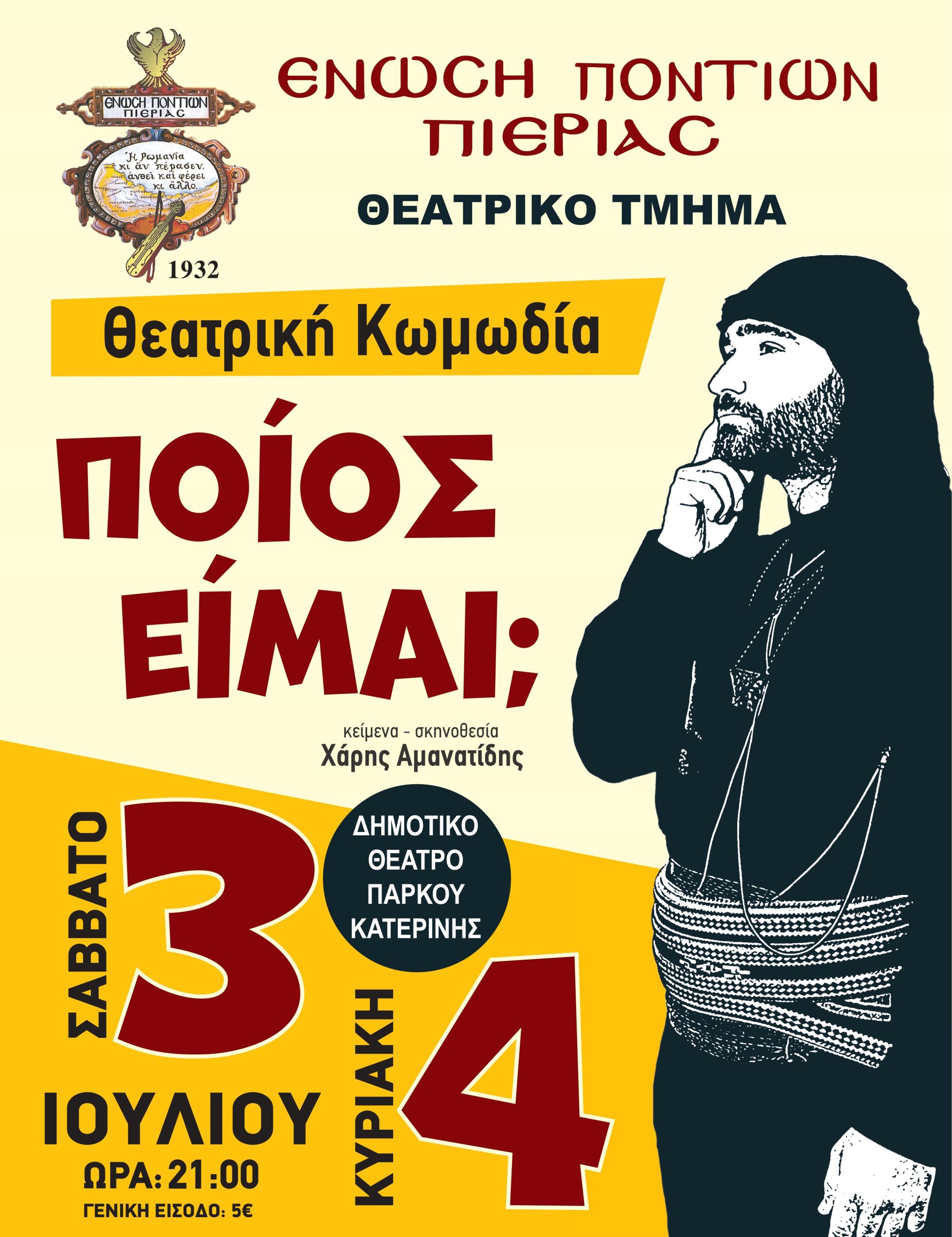 Διοργάνωση διήµερου θεατρικών παραστάσεων του συλλόγου, της Νέας ποντιακής θεατρικής κωµωδίας ¨Ποίος είµαι;¨, σε κείµενα-σκηνοθεσία του κ. Χάρη Αµανατίδη, από το Θεατρικό τµήµα του συλλόγου στο Δηµοτικό Θέατρο Πάρκου Κατερίνης.