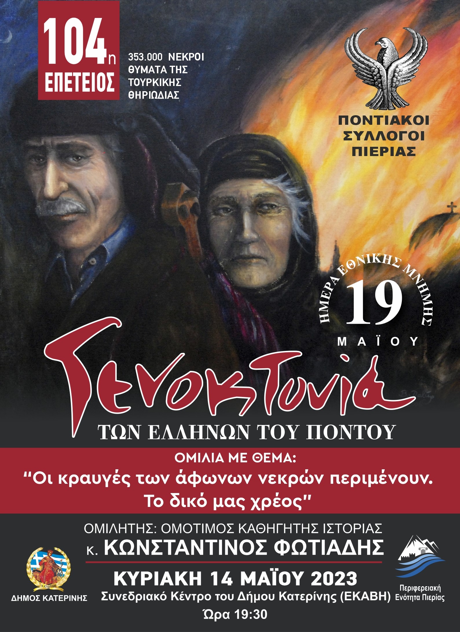 Η Ένωση Ποντίων Πιερίας συμμετείχε δυναμικά στις εκδηλώσεις Τιμής και Μνημοσύνης την Κυριακή 14 Μαΐου 2023, για την 104η επέτειο της Γενοκτονίας του Ποντιακού Ελληνισμού με τους Ποντιακούς συλλόγους της Πιερίας.