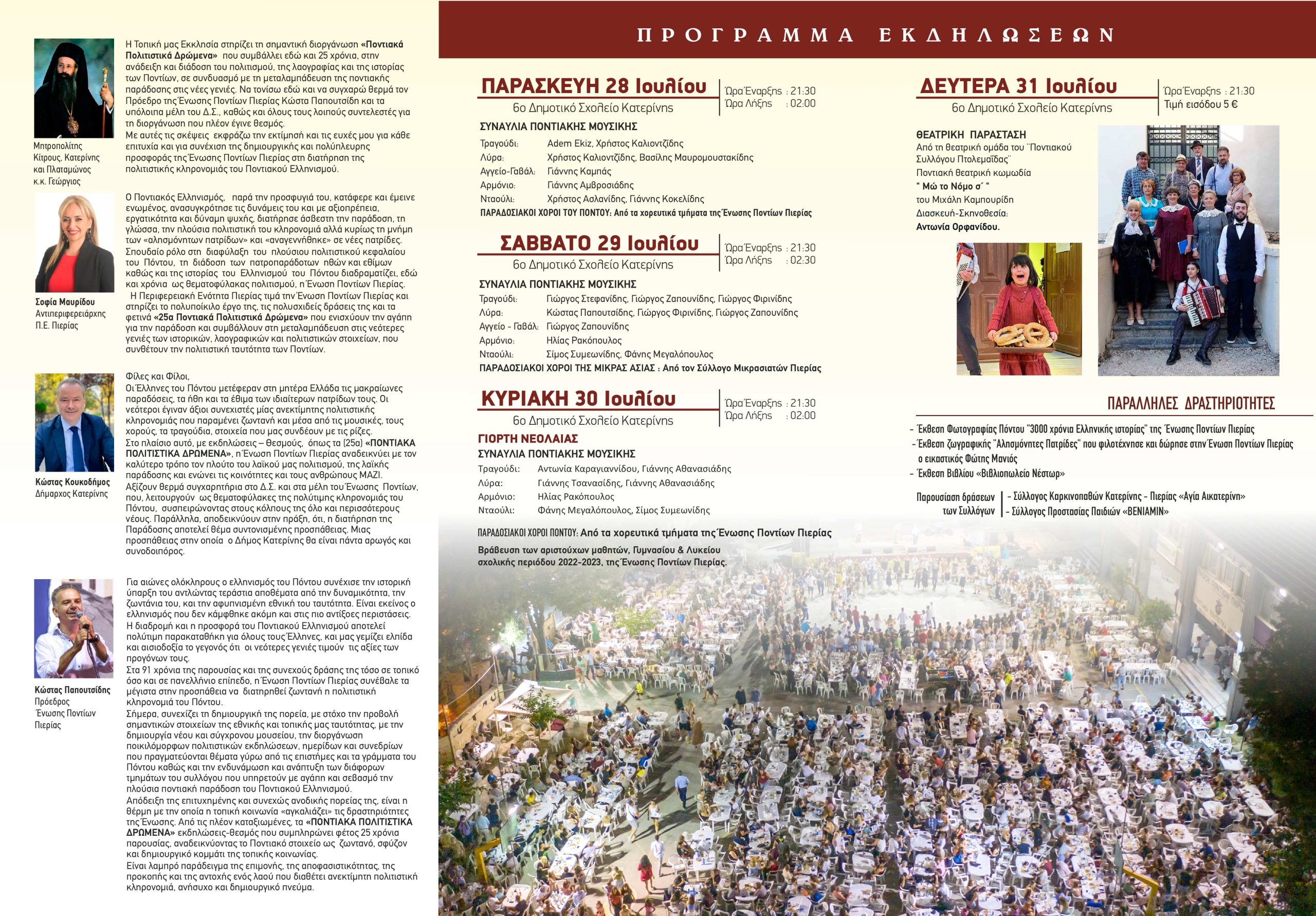Την Παρασκευή 28 Ιουλίου 2023, οι εκδηλώσεις άνοιξαν με ποντιακό παραδοσιακό πρόγραμμα, με τους εξαίρετους, Adem Ekiz στο τραγούδι ο οποίος ταξίδεψε από την Τραπεζούντα του Πόντου αποκλειστικά για την εκδήλωση, και τον Χρήστο Καλιοντζίδη στο τραγούδι-λύρα. Επίσης συμμετείχαν, στο τραγούδι-λύρα ο Βασίλης Μαυρομουστακίδης στο αγγείο-γαβάλ ο Γιάννης Καμπάς στο λαούτο ο Νίκος Σιδηρόπουλος στο αρμόνιο ο Γιάννης Αμβροσιάδης και στο νταούλι ο Χρήστος Ασλανίδης και ο Γιάννης Κοκελίδης. Τα χορευτικά σχήματα της Ένωσης Ποντίων Πιερίας εντυπωσίασαν παρουσιάζοντας παραδοσιακούς ποντιακούς χορούς. Ο Πρόεδρος του συλλόγου κ. Κώστας Παπουτσίδης καταφανώς συγκινημένος απένειμε τιμητικό ενθύμημα εκ μέρους του Διοικητικού Συμβουλίου στον ποντιόφωνο Adem κάνοντας αναφορά σε όλους αυτούς που μένουν εκεί στις Αλησμόνητες Πατρίδες και ομιλούν την ποντιακή διάλεκτο αλλά και στο συμβολισμό της παρουσίας του Adem Ekiz στα Ποντιακά Πολιτιστικά Δρώμενα. Παρών στις εκδηλώσεις έδωσε και το τμήμα του Ελληνικού Ερυθρού Σταυρού.
