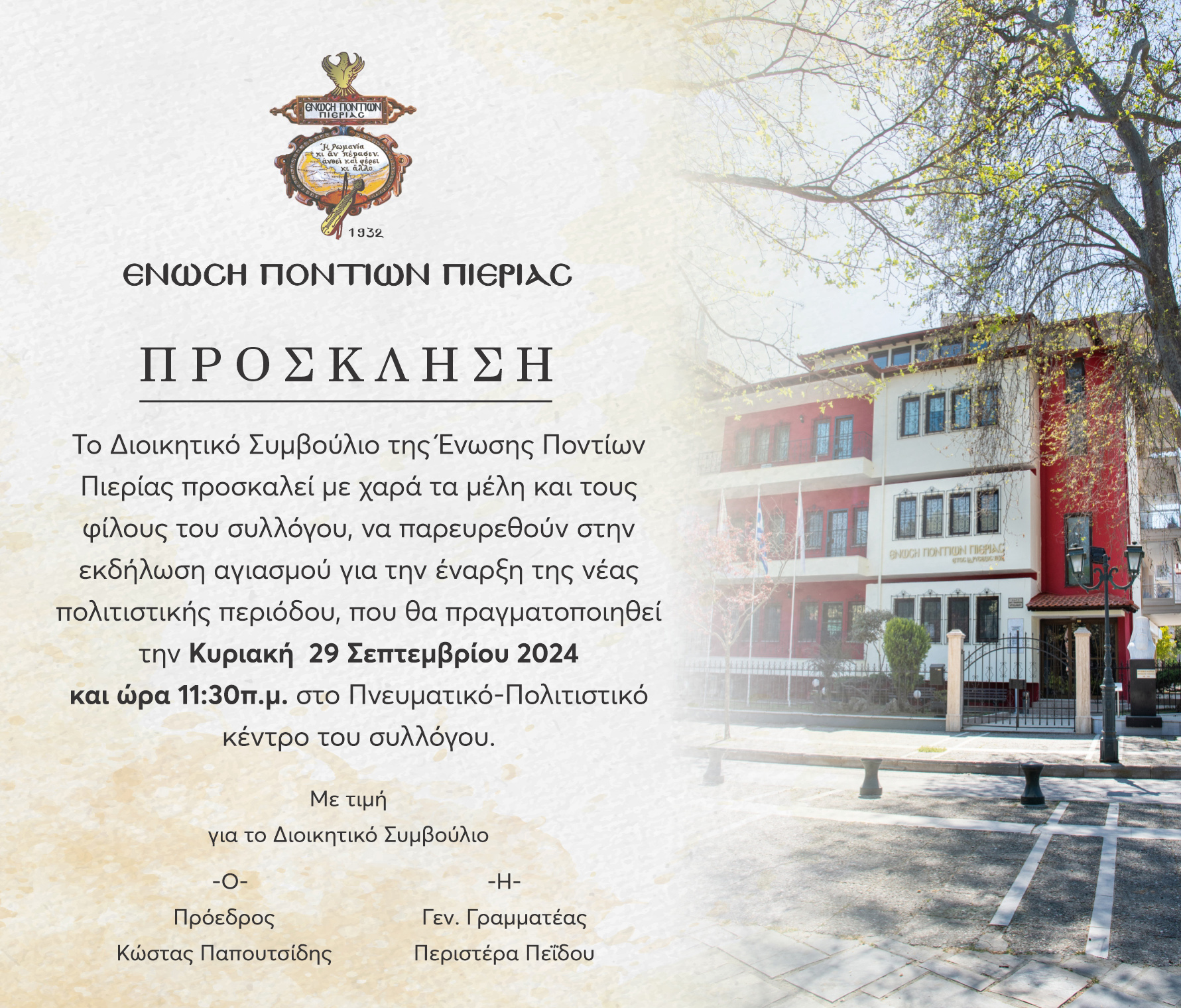 Το Διοικητικό Συμβούλιο της Ένωσης Ποντίων Πιερίας προσκαλεί με χαρά τα μέλη και τους φίλους του συλλόγου, να παρευρεθούν στην εκδήλωση αγιασμού για την έναρξη της νέας πολιτιστικής περιόδου, που θα πραγματοποιηθεί την Κυριακή 29 Σεπτεμβρίου 2024 και ώρα 11:30π.μ. στο Πνευματικό-Πολιτιστικό κέντρο του συλλόγου.