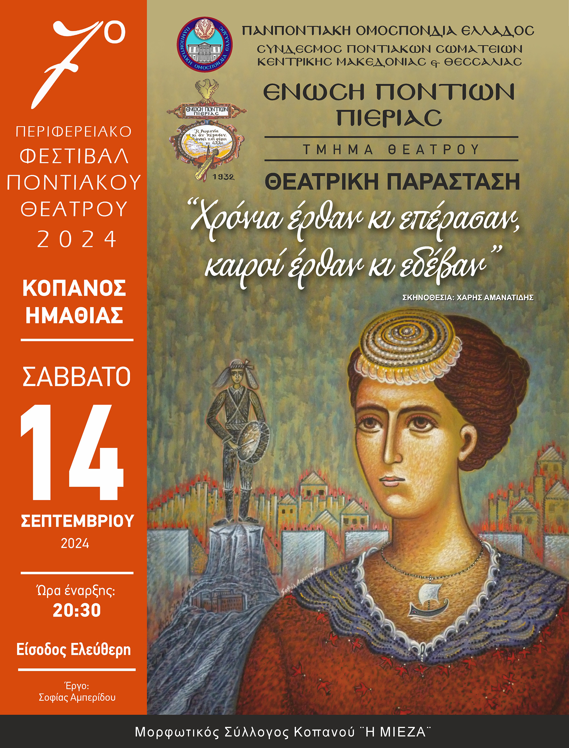 Η Ένωση Ποντίων Πιερίας υπηρετώντας πιστά εδώ και δεκαετίες το ποντιακό θέατρο, με χαρά συμμετέχει για μία ακόμη χρονιά στο 7ο Φεστιβάλ Ποντιακού Θεάτρου που διοργανώνει ο Σ.ΠΟ.Σ. Κ. Μακεδονίας και Θεσσαλίας της Παμποντιακής Ομοσπονδίας Ελλάδος, το Σάββατο 14 Σεπτεμβρίου 2024 στον Κοπανό Ημαθίας, παρουσιάζοντας με το αξιόλογο Θεατρικό της τμήμα μία μοναδική νέα θεατρική παραγωγή της Ένωσης Ποντίων Πιερίας ¨Χρόνια έρθαν κι επέρασαν, καιροί έρθαν κι εδέβαν¨ σε σκηνοθεσία του Χάρη Αμανατίδη.